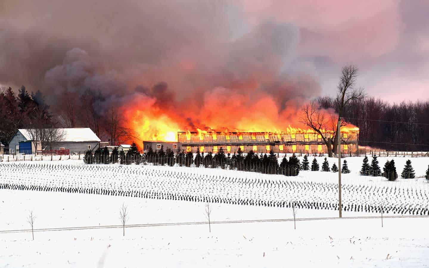 Fire completely levelled a two-storey chicken barn on the Third Line of Mapleton Township January 9. Damage was pegged at $250,000.